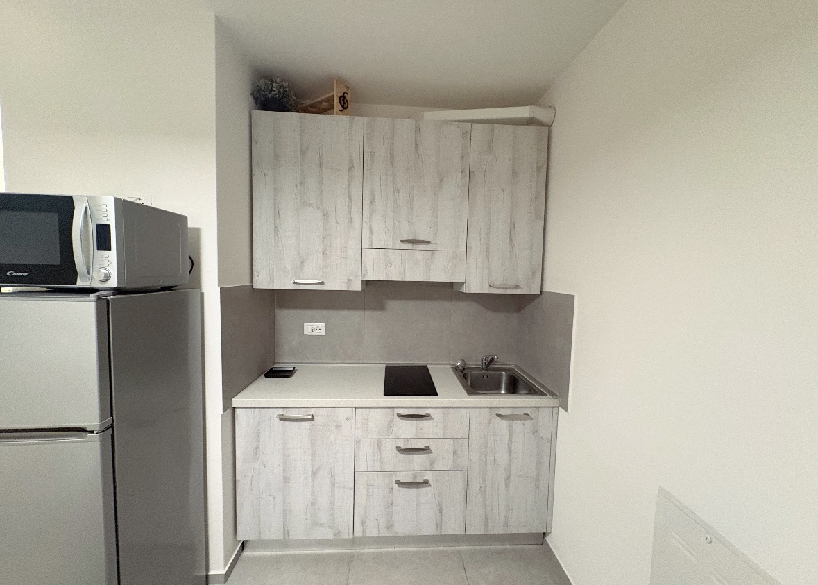 La soluzione è così composta: ingresso che si affaccia nel soggiorno con angolo cottura, camera matrimoniale, bagno cieco con doccia.