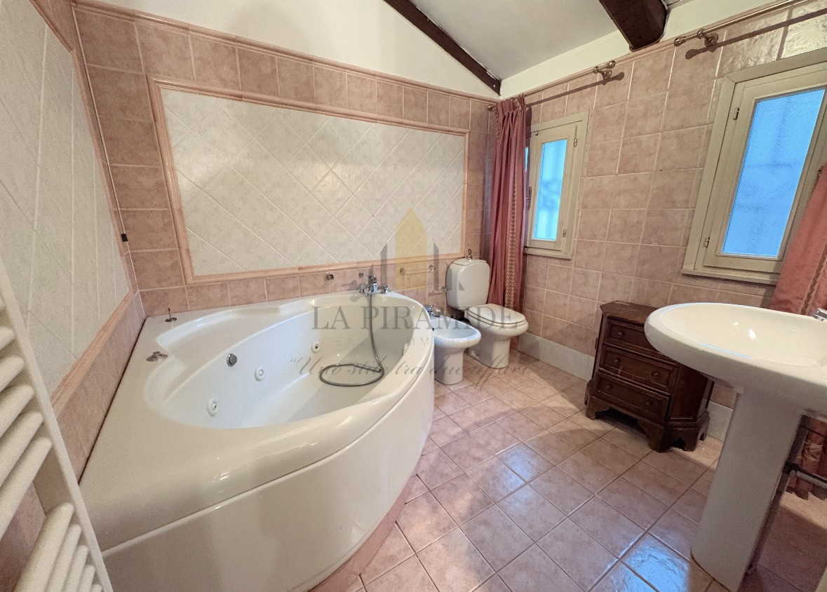 Al piano inferiore troviamo l’ingresso, una camera da letto e un bagno con vasca idromassaggio.