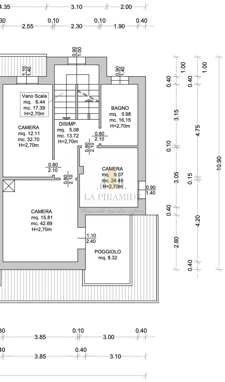 Salendo al primo piano, la zona notte è composta da tre camere da letto a scalare, secondo bagno finestrato e poggiolo.