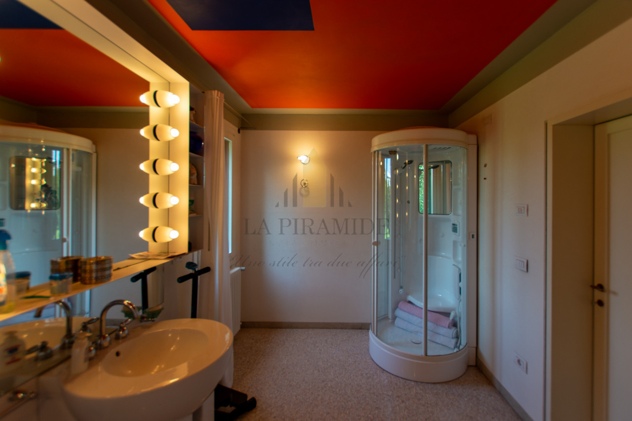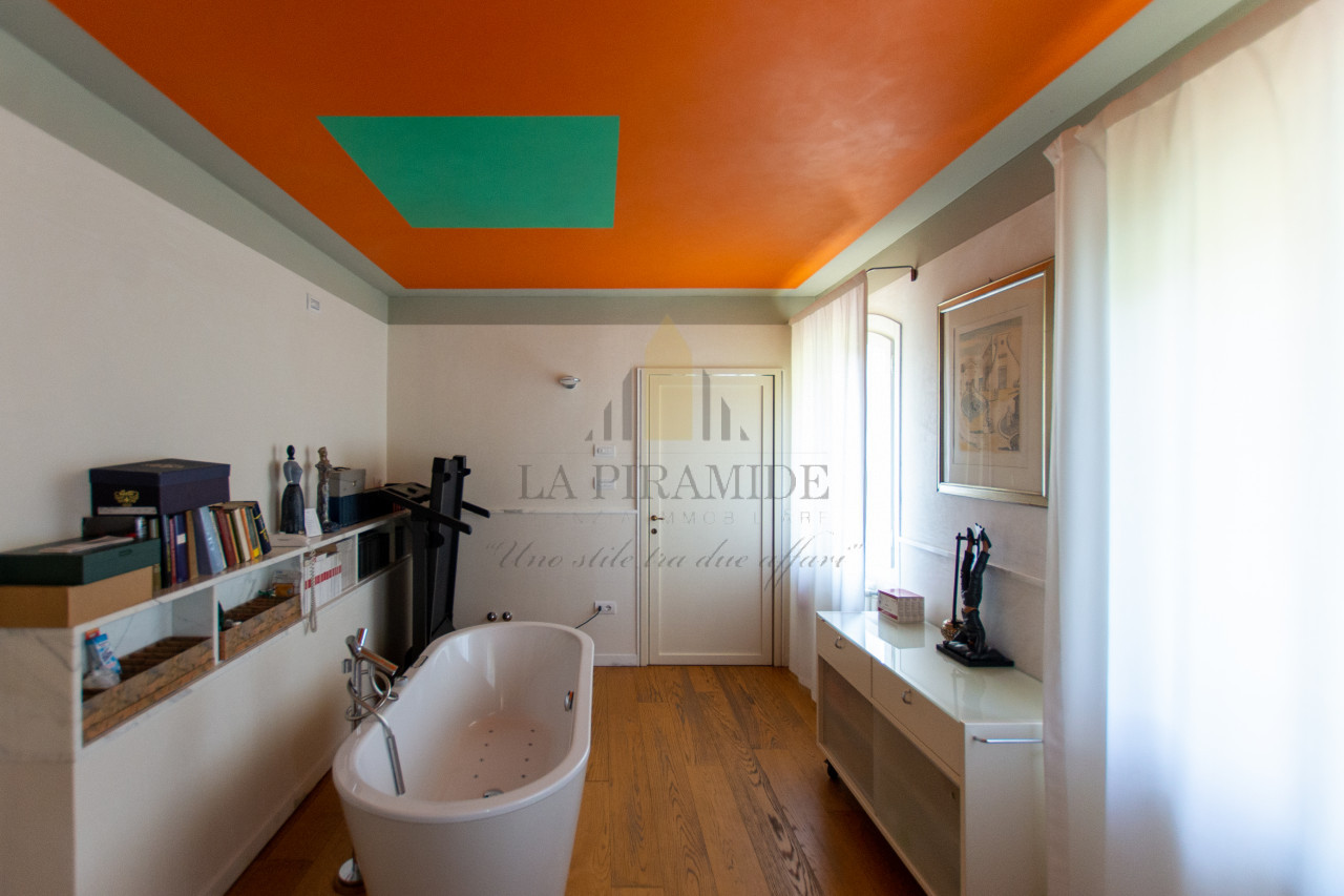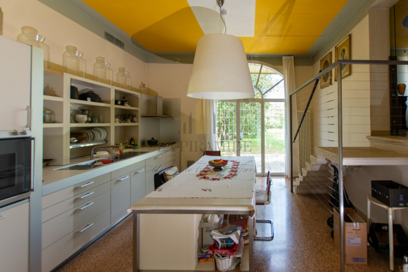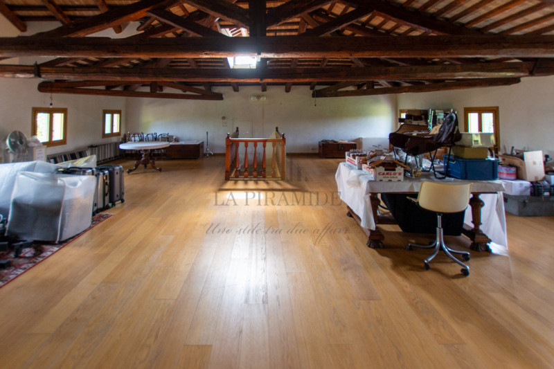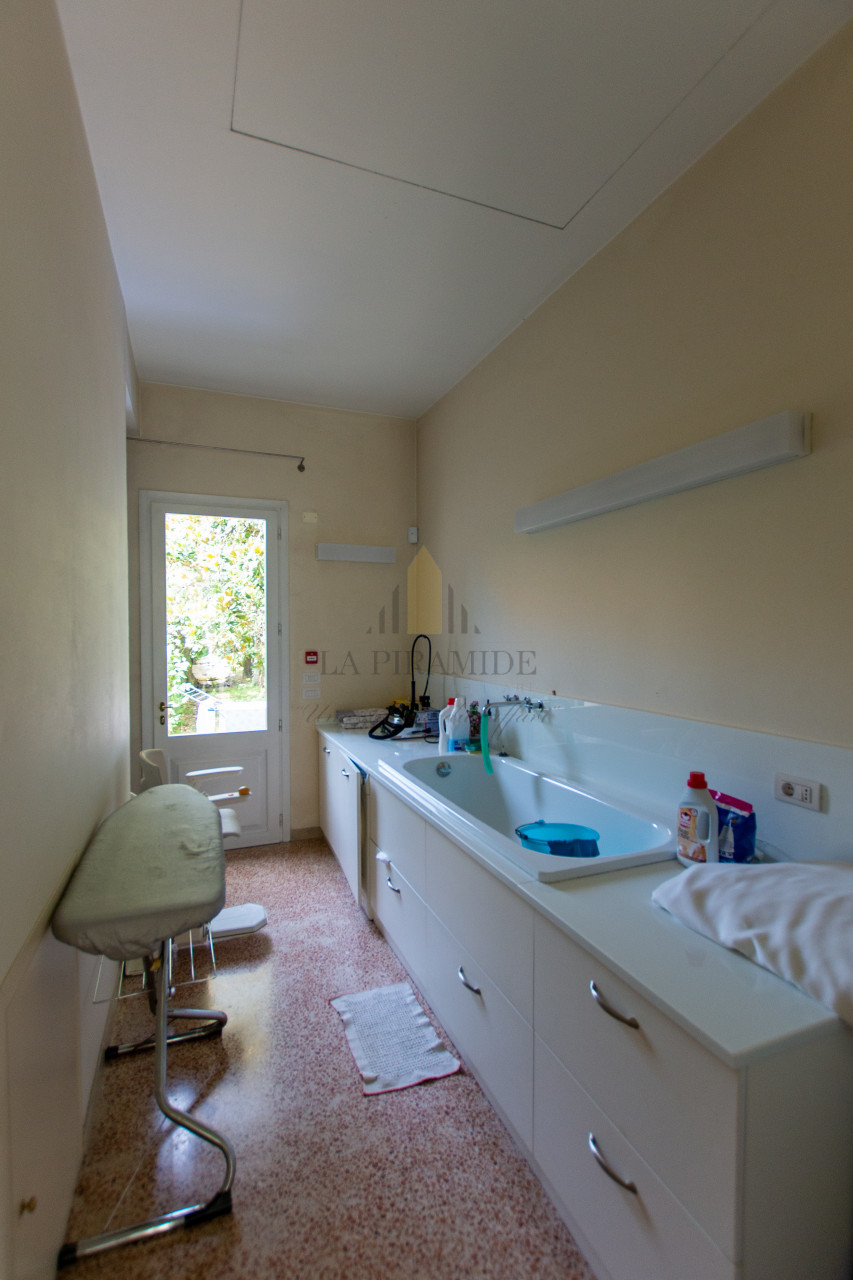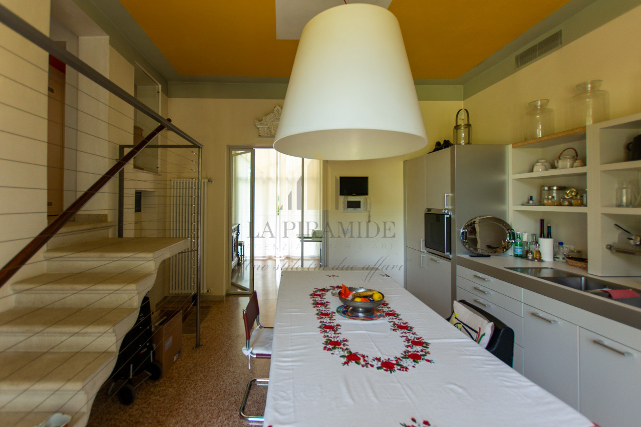 Al piano terra trovano spazio una zona giorno luminosa, una sala da pranzo con camino monumentale, una cucina abitabile di ampie dimensioni e un piccolo studio con affaccio sul giardino.